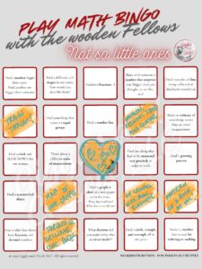 Just like the wooden Fellows in the past four weeks, we invite you to discover where math hides in your world. To make it more playful, we created “bingo cards”.